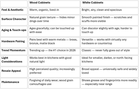 Both finishes hold up well at resale. White has historically had broader, more universal appeal across buyer demographics. Wood — particularly white oak — is gaining ground quickly and is increasingly viewed as a premium finish rather than a niche one. If you're planning to sell soon and want to play it safe, white is still the more conservative choice. If you're staying for the long term, choose what genuinely resonates with you.