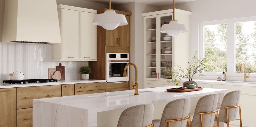Reico Charlottesville team member Azurae Burdett shared,"off-white cabinets mixed with warm wood finishes make kitchens feel welcoming and balanced. The natural wood brings cozy warmth and texture. The off-white finishes make the room feel brighter, cleaner, and more open. I think this is a great combo that looks stylish and modern, but comfortable and lived in."